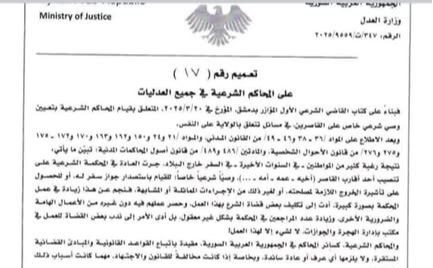 تمّ إصدار التعميم رقم (17) بتاريخ 10 تشرين الثاني 2025 عن وزارة العدل السورية الذي أثار الجدل بعد بدء العمل به في بداية شهر كانون الأول 2025 حيث ينص القرار على حصر الولاية على نفس القاصر بالعصبة من جهة الأب وإن لم يكن له صلة بالطفل ويلغي ما كان معمولاً به في المحاكم الشرعية من حيث تعيين وصي خاص على القاصر (في كثير من الأحيان والدته) لتسيير أموره ومنها استصدار جواز سفر والحصول على تأشيرة خروج لمصلحته وغيرها من الأمور المماثلة.